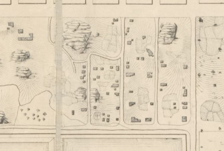 As Salwen wrote those words, Roy Rosenzweig and Elizabeth Blackmar were answering his call. As early as 1987, Rosenzweig had produced a list of 323 residents in the village. They were a mix of laborers, shop owners, and farmers. The information he collated included their full name, number of family members, ID number, age, years lived in the city, employment, birthplace, and the number of lots, shanties, framehouses, stables, sheds, and piggeries they owned. Most of the sources he pulled these names from were baptismal records.[14] He also drew rudimentary plot maps of the village. In their 1992 book, The Park and the People, Rosenzweig and Blackmar included around thirty pages on Seneca Village, using it as the example of removal via eminent domain in creating Central Park.
